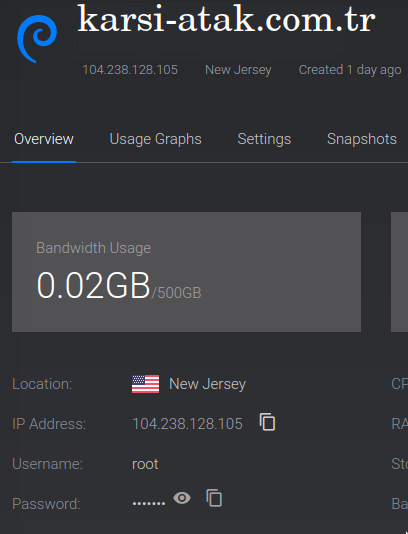 Şimdi Vultr'ın sitesinde, VPS'nizi tıklayın ve sunucunuzun şifresini gösteren bir alan göreceksiniz.